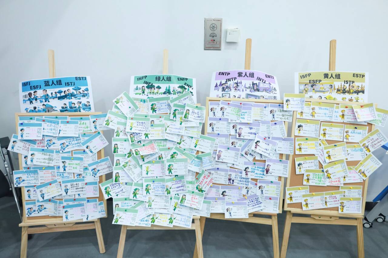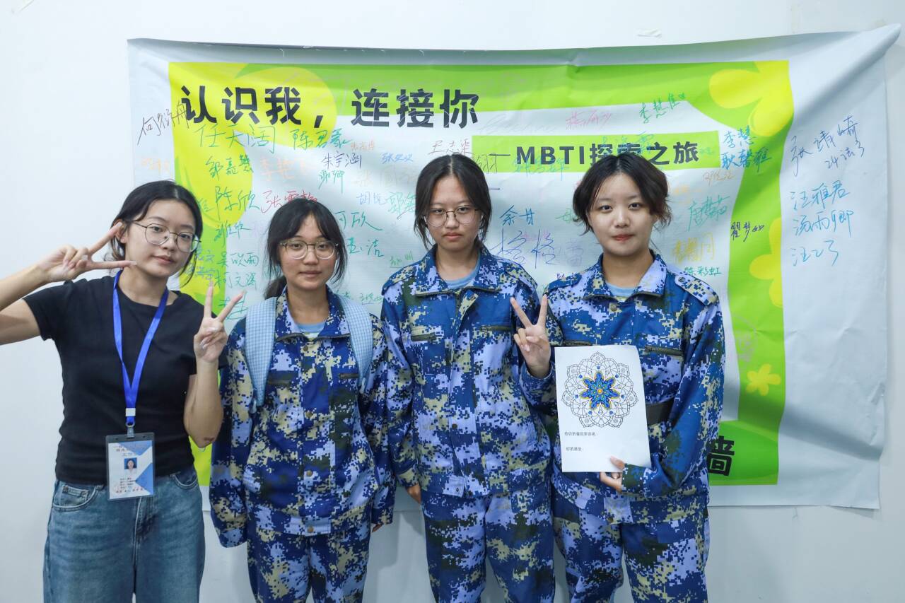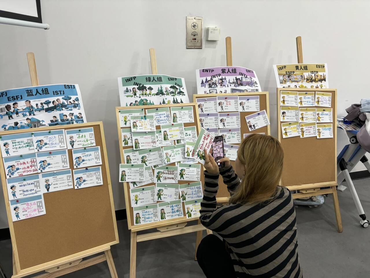 计算机类专业2025(2)班的沈紫娴低头沉思,伏案一一勾画下对应的MBTI测试选项,从一系列的选择中渐渐“描摹”出量身定制的“人格画像”。“我的‘人格’是ENFP,也就是通常被叫做充满活力和好奇心的‘快乐小狗’。”得到测试结果后,沈紫娴在“ENFP”的明信片上一笔一划写下了“天天开心”的寄语,并张贴在了“绿人组”的专属展板上。“测试的结果还挺符合我的预期的,我对自己的性格有了更深入的了解。”她笑着说。