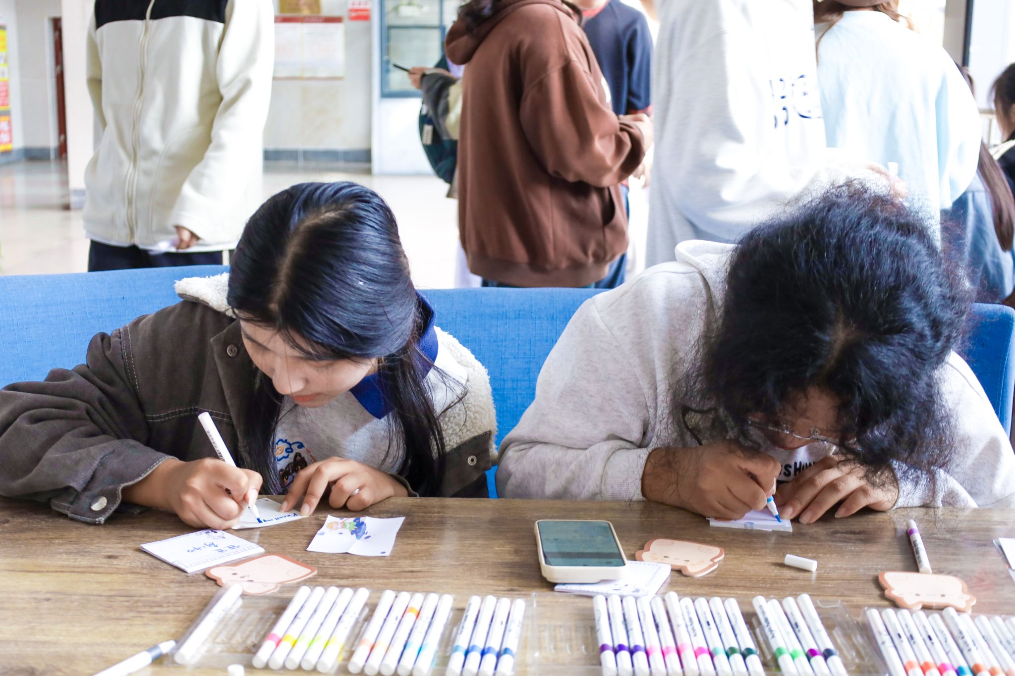 活动现场布置简洁而温馨,大厅中央的长桌上,三盒丙烯马克笔整齐排列,旁边堆叠着印有小王子、小猫、小熊等萌趣图案的便利贴,还有剪刀、胶水等工具随时待用。无需专业基础,学生们只需挑选心仪的纸张和画笔,用英语、日语、韩语、中文、法语、意大利语等任意语种,写下当下的情绪关键词——或是“Peace”“希望”的期许,或是“Relax”“释然”的倾诉,再搭配简单的涂鸦或剪裁,一张专属情绪卡片便应运而生。